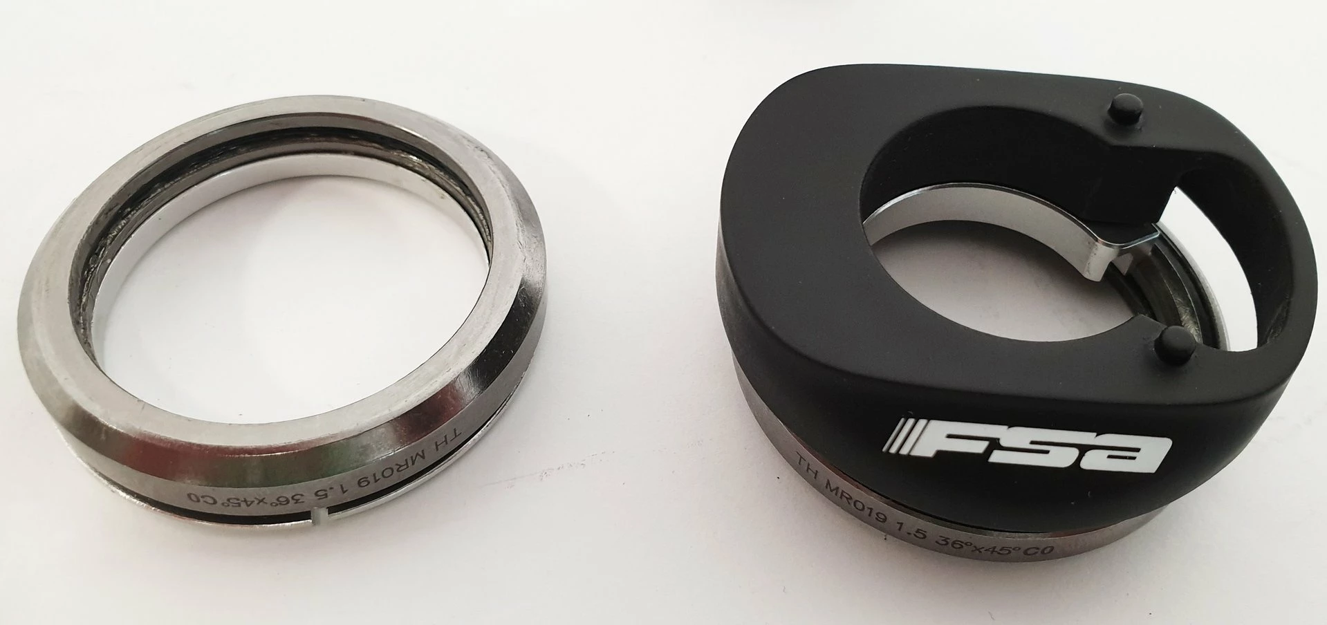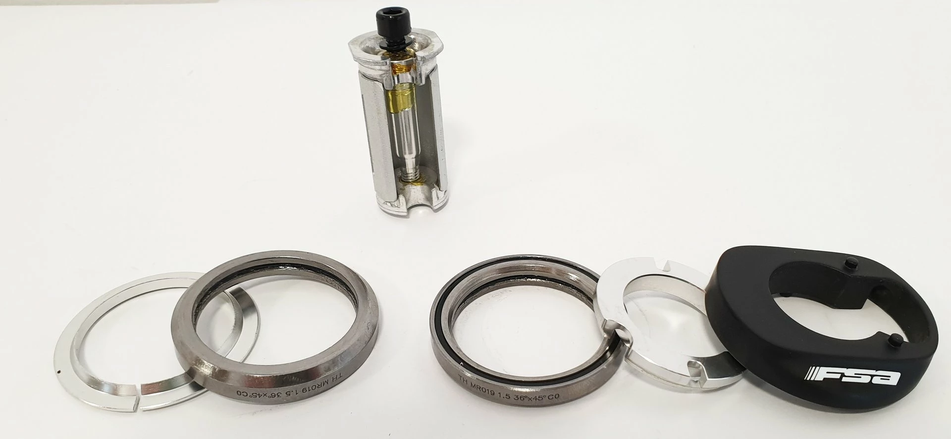 Innovativer, voll Integrierter Aluminium-Steuersatz für tapered Steuerrohre von 1 1/8 Zoll auf 1.5 Zoll mit oberer Abdeckkappe und hochwertigem Gabelkonus aus Aluminium. Oberes Lager 1 1/8 Zoll – 36°/45° ACB (Cane Creek Norm) Schrägschulterlager für hohe Stabilität und Haltbarkeit. Unteres Lager 1.5 Zoll – Rillenkugellager. Der No. 55R besitzt folgende Lagereinbaumaße – innen/ außen: 52/56 mm.
