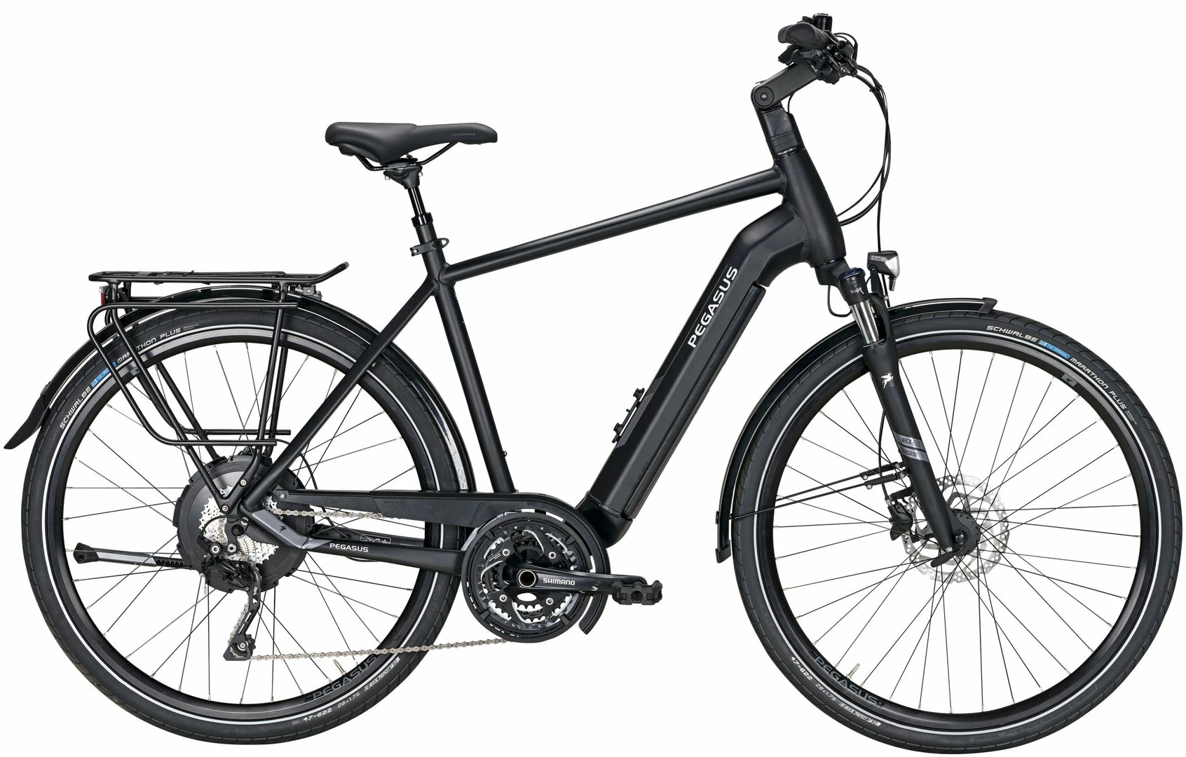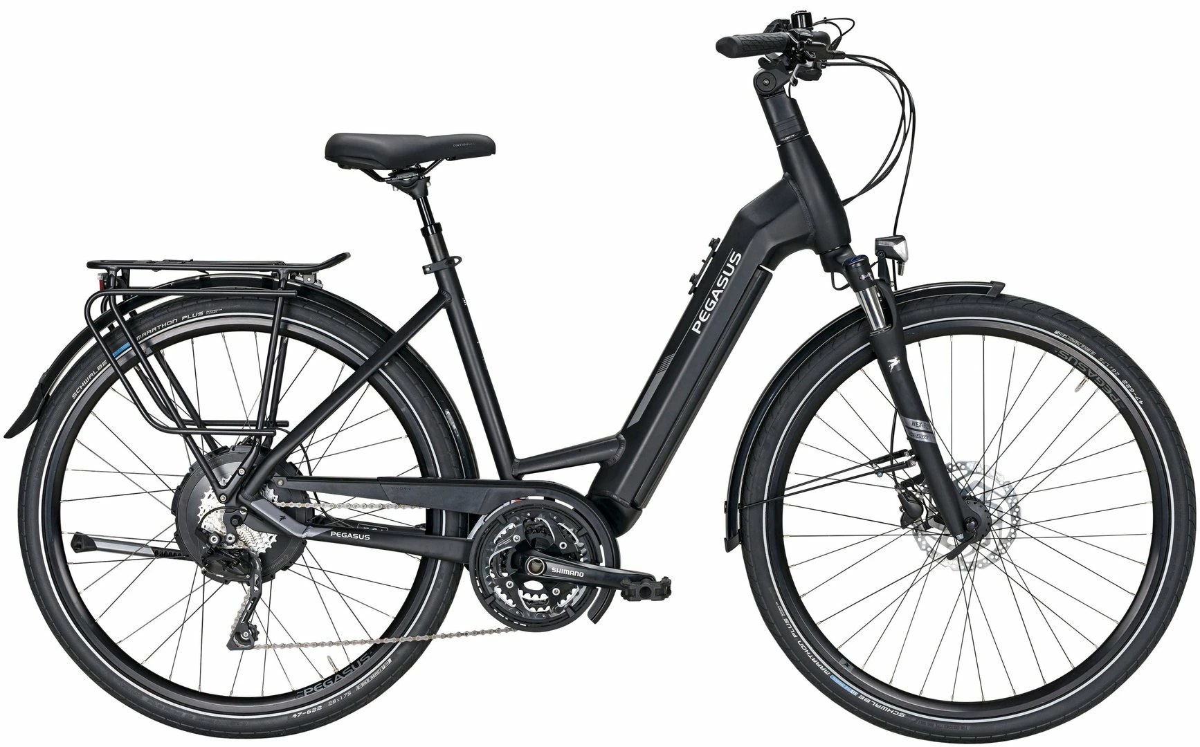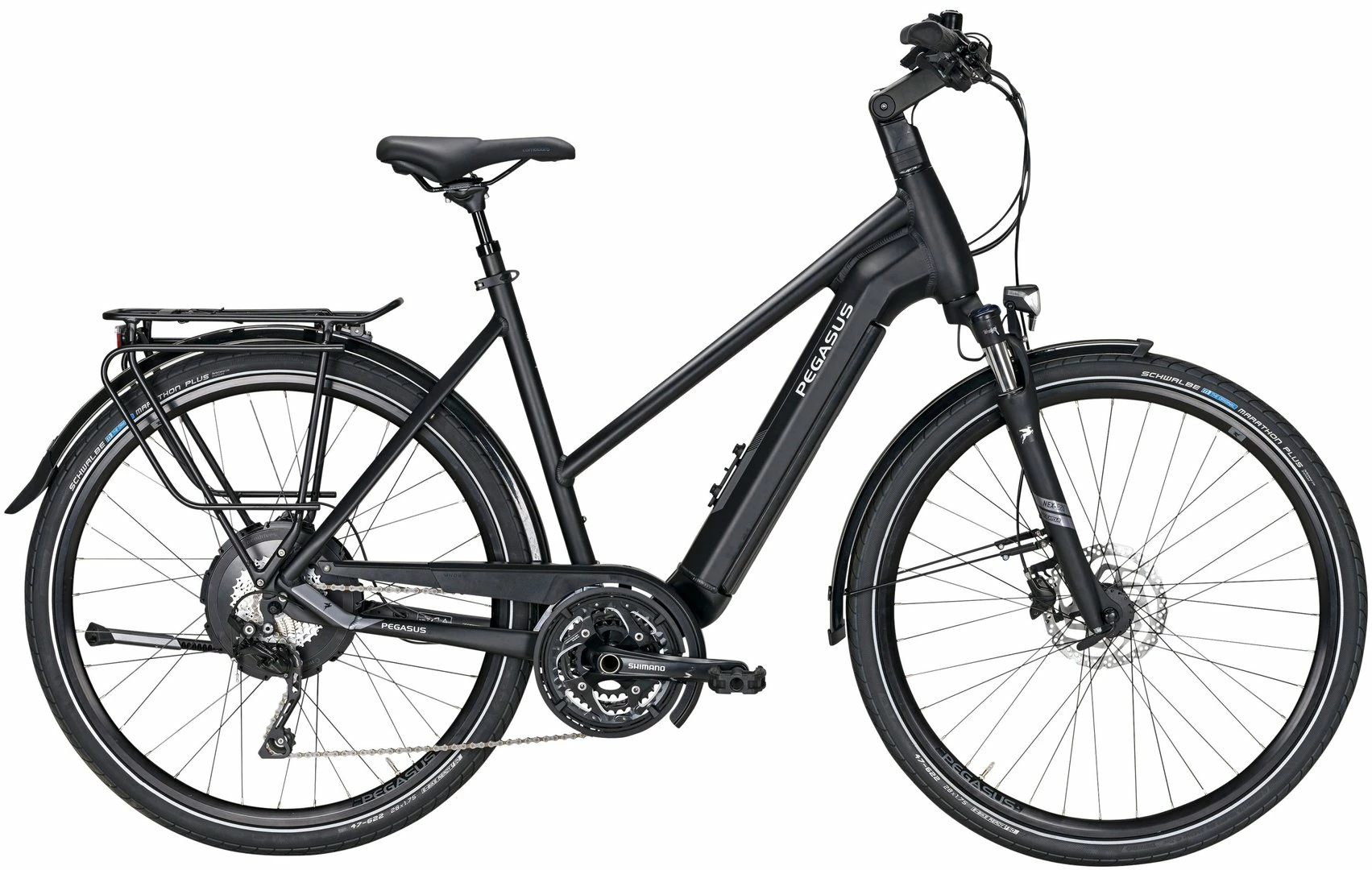 Alu-Rahmen mit tapered Steuerrohr, NEX-E25-LO Federgabel, Deore Schaltwerk, Schalthebel und Umwerfer, T-551 Tretlager, Shimano MT-201 Disc-Bremsen, Ryde Andra-20 / X-Plorer Felgen, Nabenmotor im Hinterrad 250W/40Nm, 750Wh Akku, 70 Lux LED-Lampe mit Stand- und Tagfahrlicht, LCD-Display, Marathon Plus Reifen (47-622)