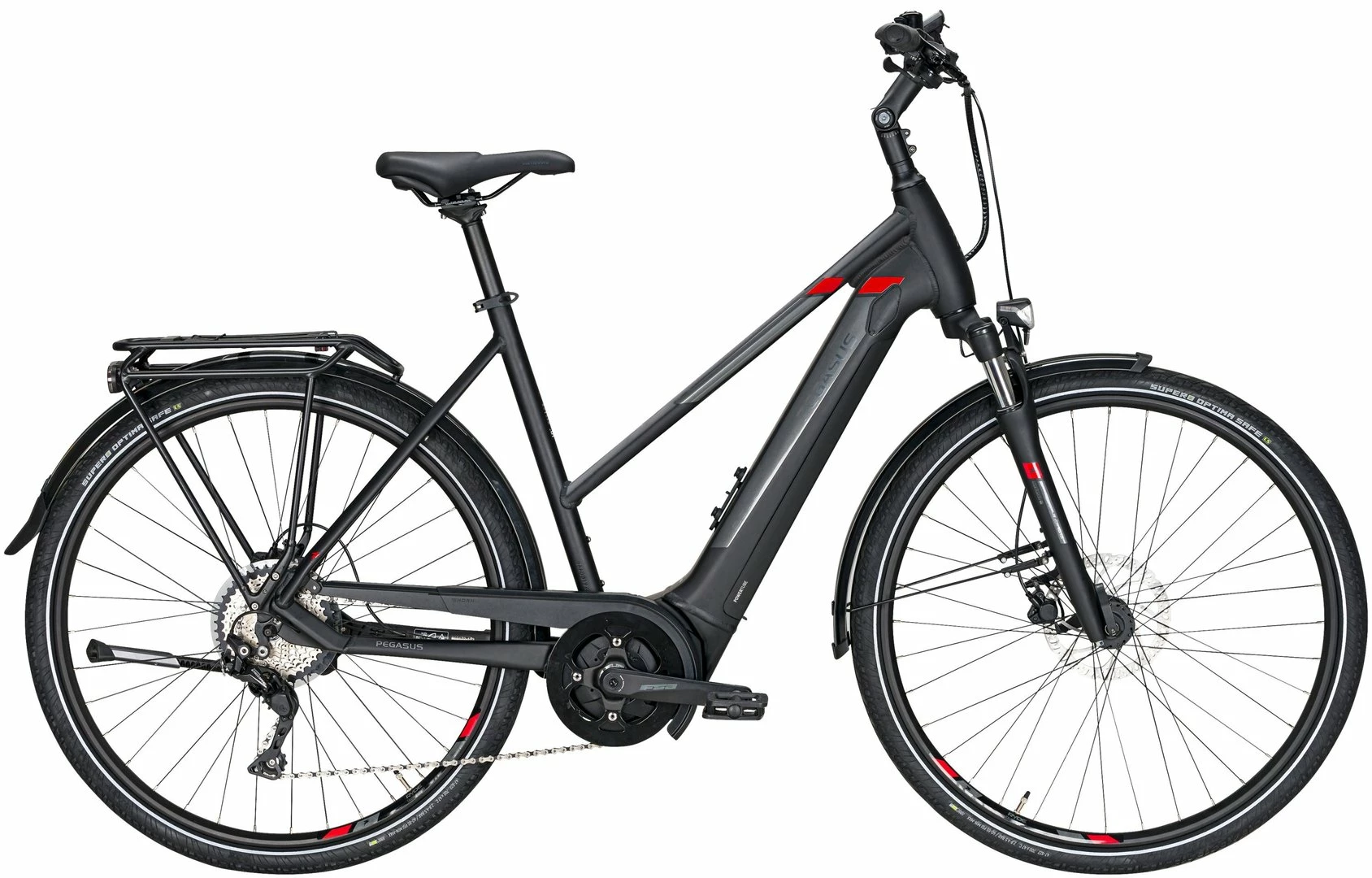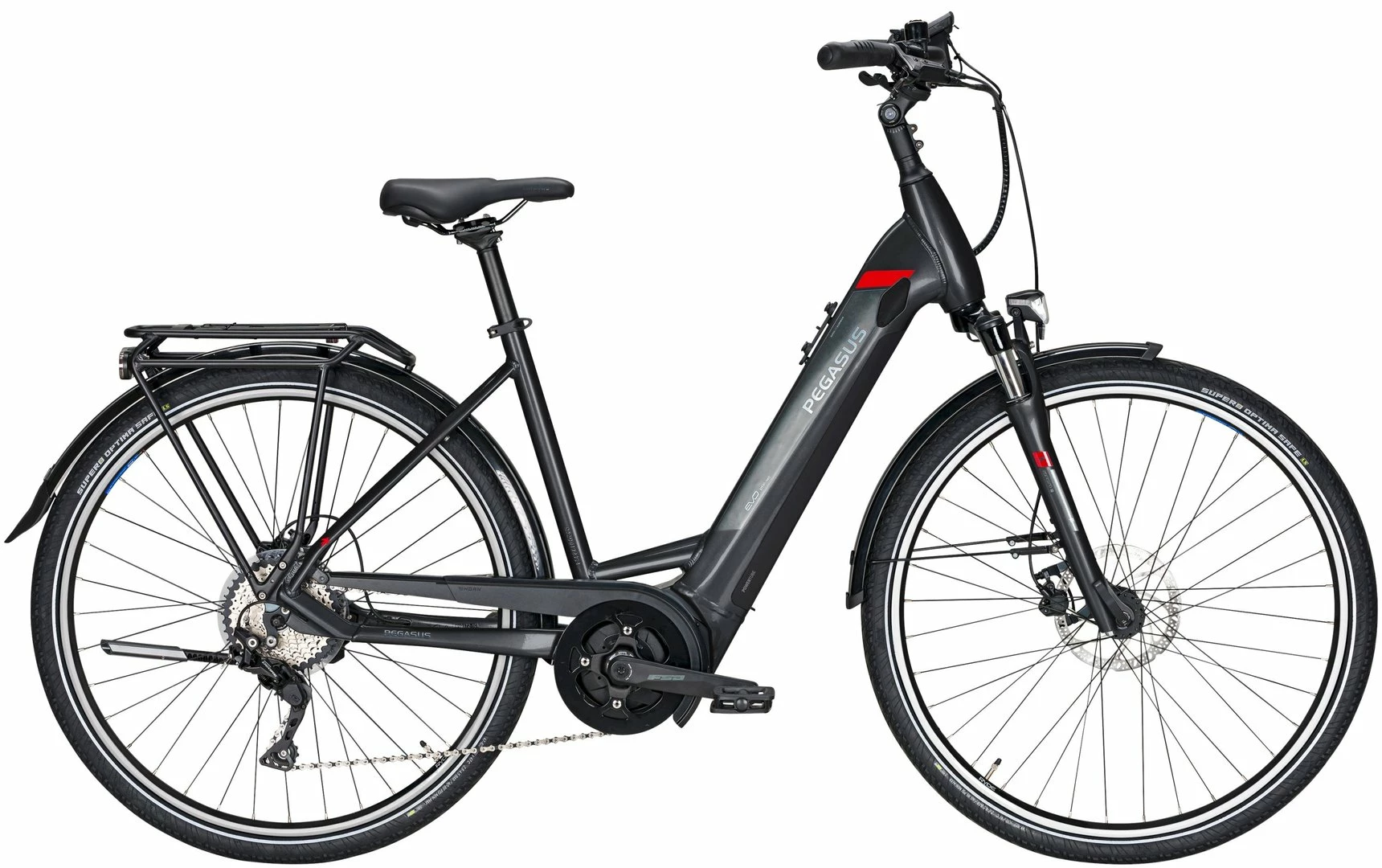 Beim Premio Evo 10 stehen Fahrkomfort und harmonische Formgebung im Mittelpunkt. Als vielseitiges Trekkingbike konzipiert, vereint es den angenehmen Charakter eines nachdrücklich anschiebenden Bosch-Motors mit dem hohen Komfort einer aufrechten Sitzposition, ergänzt durch die Stoßabsorption einer weich ansprechenden Federgabel. Der in drei Varianten verfügbare Rahmen ist dank innenliegendem Akku besonders glattflächig; eng ans hintere Schutzblech geschmiegt ist der solide Gepäckträger mit seinen schräg abfallenden Seitenteilen. Danke der gut erreichbaren Ladebuchse am Unterrohr lässt sich der mit 400, 500 oder 625 Wattstunden verfügbare Akku einfach mit Strom versorgen. Zum großen Übersetzungsumfang der 10-Gang-Kettenschaltung kommen kräftige Scheibenbremsen; rutschfeste Pedale und eine helle Lichtanlage bieten zusätzliche Sicherheit.